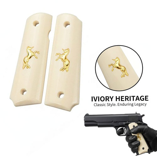 1911 Golden Horse Logo Custom Hand Grips Design. Made in Resin White color. To make sure that would fit. Please measure from center to center screw 3 1/16. This would fit on both ambidextrous and non-ambidextrous safety configuration FITS on Commander, Government, and Gold Cup Models 1911 Government Model Clones