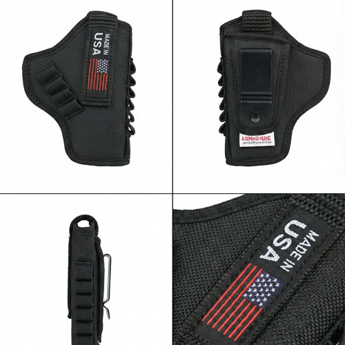 Rugged & Reliable Constructed from tough, padded nylon, this holster protects your firearm’s finish from scratches and dings. The heavy-duty metal clip ensures the holster stays planted on your belt, while the adjustable thumb-break strap keeps the gun locked in place until you decide to draw. Proudly displaying the “Made in USA” patch, this holster is built to last.