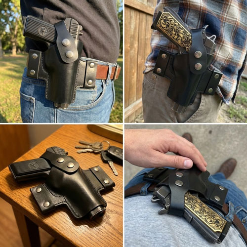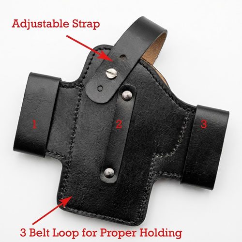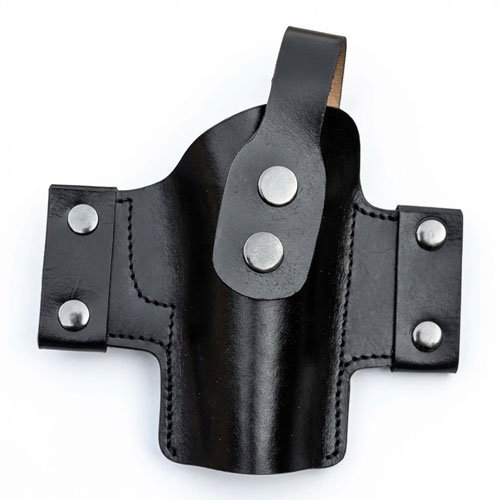 Popular among law enforcement and citizens with concealed handgun licenses, this compact design keeps your pistol high on your waist and very snug against your body. Fits most large semi-automatics.