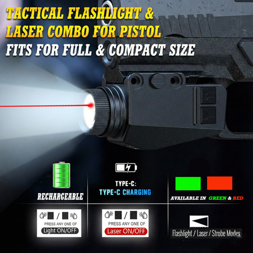 Tactical Flashlight with Laser For Pistol Rail Mount Combo Fits for Full & Compact Rail, Shockproof Red or Green Laser Sight and Gun Light with Strobe