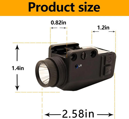 Feature Detail Max Brightness 500 Lumens Battery Type Built-in 400mAh Charging Type-C Interface ($\approx 2$ hrs) Material Aluminum Alloy, Plastic Dimensions 66mm x 31.2mm x 35.5mm Rail Compatibility 20-22mm Wide Rail Runtime (LED Only) $\approx 1.5$ Hours Runtime (LED + Laser) $\approx 1.3$ Hours (Red) / $\approx 1.2$ Hours (Green) 📦 What’s Included