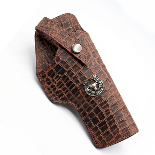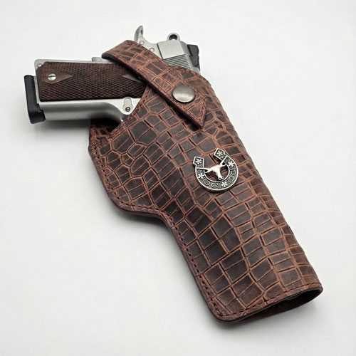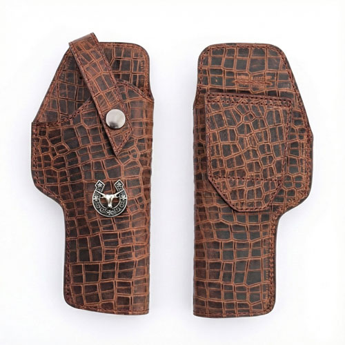 Combine rugged Western style with reliable functionality. This Outside-the-Waistband (OWB) leather holster is designed specifically for full-size frames like the classic 1911 and TT30 pistols. Featuring a striking crocodile texture and a unique metal emblem, it offers a secure carry option that looks as good as it performs.